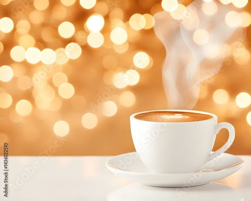 © JUMROTUL, Fototapeta premium Steaming cappuccino with heart design sits on saucer against a warm, blurred, light bokeh background