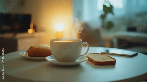 Obraz premium Steaming Coffee Bread And Phone On Table