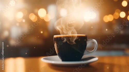 Fototapeta premium Steaming Coffee Cup In A Warm Cafe Setting