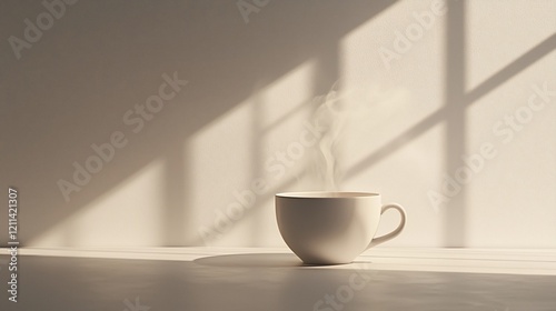 © ABIDZAR ALFAREZ, Obraz premium Steaming coffee cup in sunlit room.