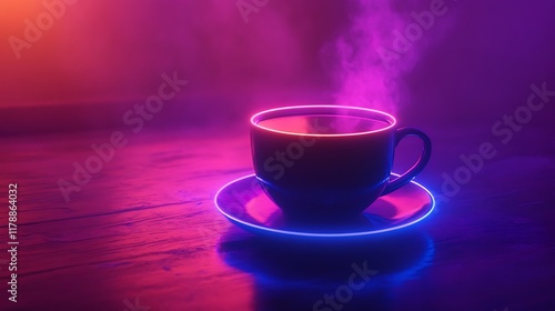 Fototapeta premium Steaming Coffee Cup Neon Glow Dark Wood Table
