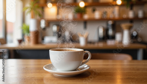 Fototapeta premium Steaming coffee cup on wooden table in cozy café, warm ambiance