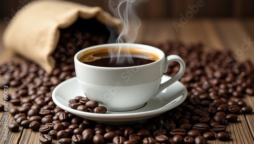 Fototapeta premium Steaming Coffee Cup Surrounded By Roasted Beans
