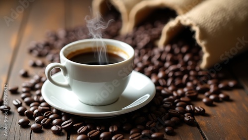 Fototapeta premium Steaming Coffee Cup Surrounded By Roasted Coffee Beans
