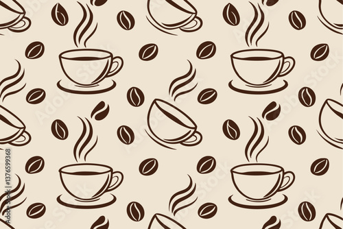 © Uttam, Obraz premium Steaming Coffee Cups, Coffee Beans, Seamless Pattern Design
