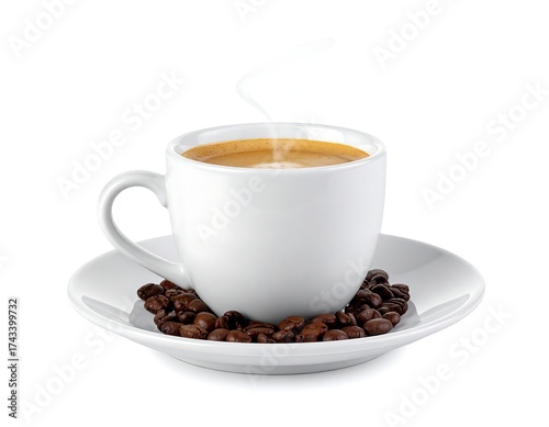 © hei, Obraz premium Steaming coffee in a white cup surrounded by coffee beans on a white saucer, isolated on white