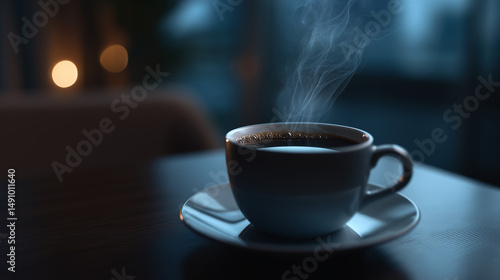 © Daniel, Obraz premium Steaming Cup of Coffee on Wooden Table in Warm Evening Light