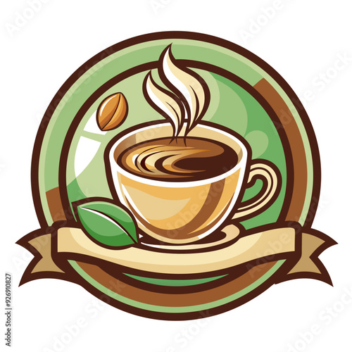 © Design Crea, Obraz premium Steaming Cup of Coffee with Bean and Leaves in a Circular Frame