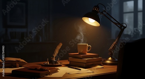 © hasan, Obraz premium Steaming cup on book stack illuminated by vintage desk lamp