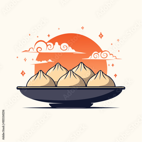 © Nani, Fototapeta premium Steaming Dumplings on a Dark Plate with Cloud Design Background.