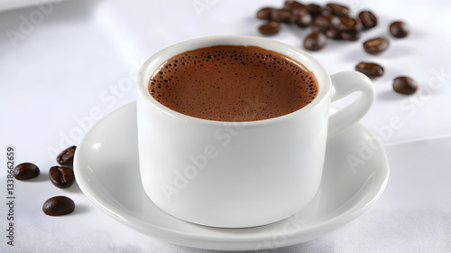 © Ajmeer, Fototapeta premium Steaming Hot Chocolate in White Cup on Marble Table – Cozy Beverage Delight