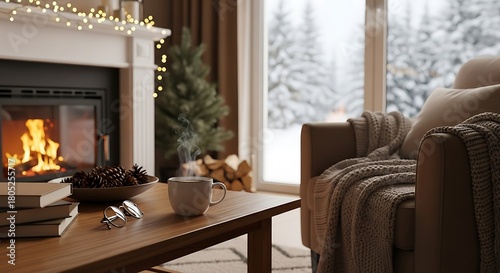 Naklejka premium Steaming mug on a coffee table in a cozy living room with a fireplace, winter window view, and Christmas decor for holiday and home comfort.
