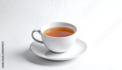 © Haji, Obraz premium Steaming tea in a white cup rests on a matching saucer against a bright, clean white background