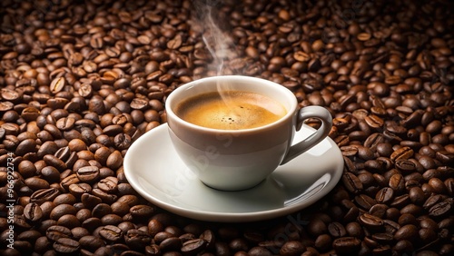 Fototapeta premium Steaming white espresso cup on saucer with coffee beans, fisheye