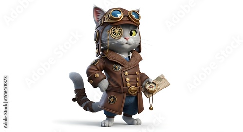 © Isaque Taylor, Fototapeta premium Steampunk Cat Navigator Character on White Background
