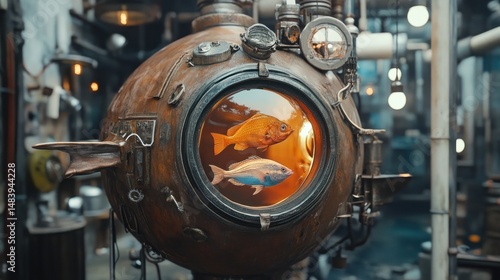 © HATO PROJECT, Fototapeta premium Steampunk fishbowl; two fish inside a rusty, spherical, mechanized enclosure