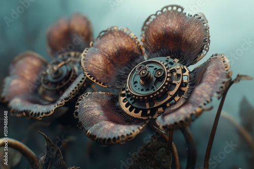 Naklejka premium Steampunk Flowers Intricate Gears Clockwork Bronze Petals Mechanical Engineering Fantasy