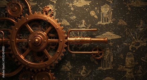 Fototapeta premium Steampunk Gears and Telescope on Space Wallpaper
