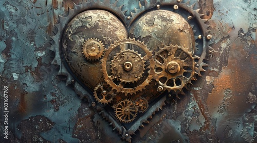 Fototapeta premium Steampunk heart with rustic gears and patina - A beautifully crafted heart featuring steampunk-style gears and a rustic patina, symbolizing love and the passage of time