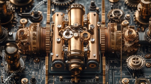 Fototapeta premium Steampunk-inspired device featuring large copper boards, antique gears, and...