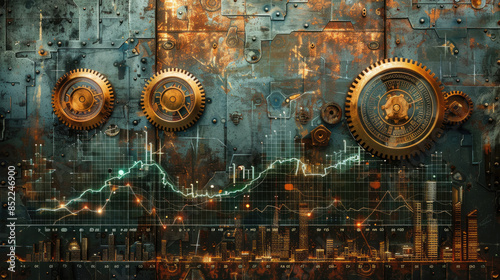 Fototapeta premium Steampunk-Inspired Industrial Background with Gears and Graphs, Futuristic Data Visualization, Mechanical Components, and Rusty Metal Texture, Perfect for Technology and Finance Themes