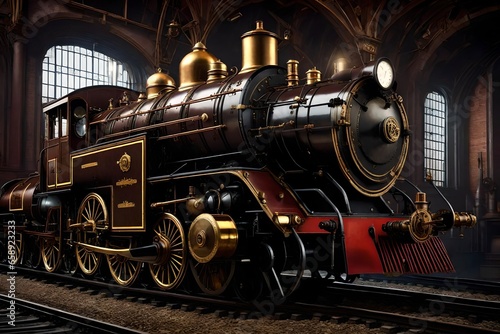 Obraz premium Steampunk locomotive rushing across the ages while time-traveling.