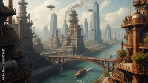 Naklejka premium Steampunk Metropolis Futuristic Cityscape with Airships and Canals