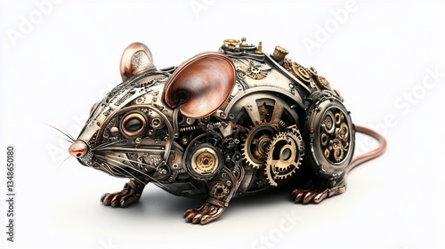 © UMI, Fototapeta premium Steampunk mouse figurine, gears, white background, art