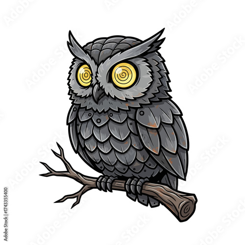© Manuja, Fototapeta premium Steampunk Owl Perched on Branch with Golden Eyes | Mechanical Fantasy Bird Illustration with Vintage Brass and Gear Details