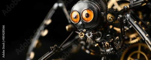 Fototapeta premium Steampunk spider robot close-up, dark background, gears visible. Sci-fi art