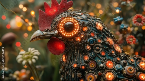 © BloomArt, Naklejka premium Steampunk Style Rooster Sculpture with Lighted Eyes