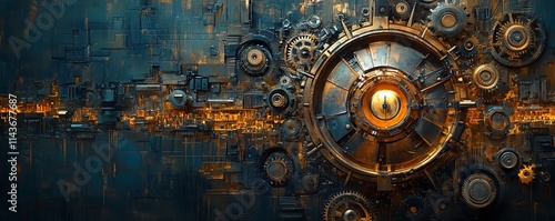 Fototapeta premium Steampunk vision, retrofuturistic cityscape with industrial elements, massive gears, steampowered machinery, horology influences, vintage Victorian style, intricate details