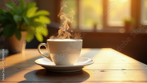 Obraz premium Steamy foam atop white cup on wooden table, morning sunlight casts a warm...