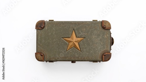 © The 2R Artificiality, Fototapeta premium Steel ammunition box adorned with a star, displayed against a white backdrop. World War II artifact.