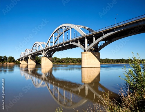 © Mencoba, Fototapeta premium Steel arch bridge spanning a calm river. Clear blue sky. Perfect reflection