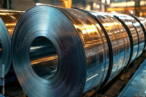 © Oleh, Obraz premium Steel coils in a metal mill, ready for global projects. Modern equipment ensures high-quality production