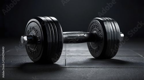 Naklejka premium Steel Determination: A heavy black dumbbell sits on a textured gray surface, a symbol of strength, perseverance, and dedication. The muted tones and sharp edges create a visually striking image.
