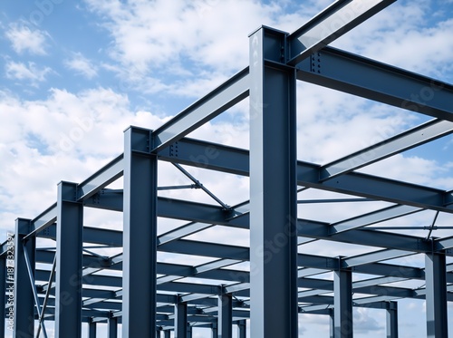 © Vasiliy, Fototapeta premium Steel framework of a building under construction. Industrial architectural structure with metal beams against a blue sky