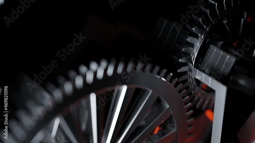 Fototapeta premium Steel gears from an engine gearbox, close up. High performance engines, concept. Digital 3D rendering.