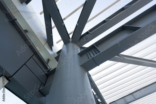 Fototapeta premium Steel structural column with intersecting truss bracing system in modern industrial architecture