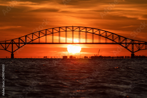 © Scott Heaney, Fototapeta premium Steel tied arch bridge over water with a sunset behind it. Telephoto large sun - Fire Island Inlet Bridge, Long Island.