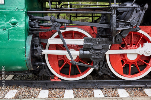 © Maksim Shchur, Naklejka premium Steel wheels old steam locomotive standing on rails, vintage train, close-up