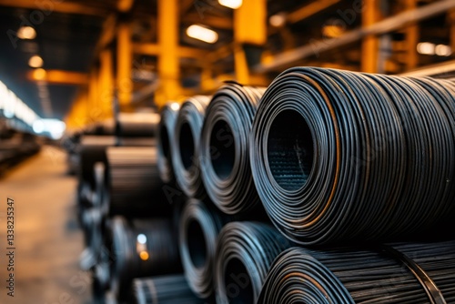 Obraz premium Steel wire rod coils stacked in warehouse, storing metal rolled wire in distribution center