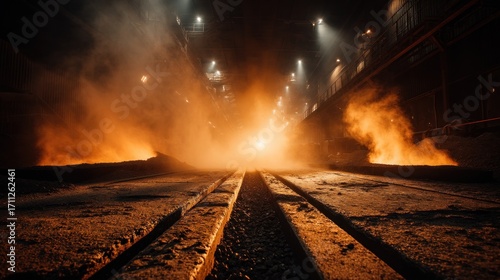 Naklejka premium Steelworks Interior with Molten Metal and Steam, Industrial Photography