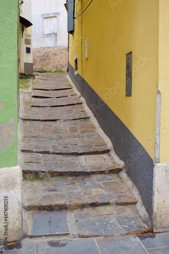Fototapeta premium Steep cobblestone narrow passage between houses in an old European town