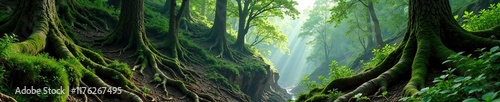 © Withun, Obraz premium Steep forest cliff with moss-covered tree roots, forest, wildflowers, canyon