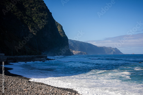 Naklejka premium Steep forested cliffs rise over a pebble beach and Atlantic surf on Madeira's north coast, Portugal. Terraced villages dot slopes, a headland curves, midday light defines
