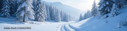 Fototapeta premium Steep hillside covered in a blanket of snow and frosty branches, forest, frost