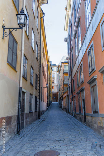 © Jorens, Fototapeta premium Steep, narrow, and quiet cobblestone alley in a historic European city center