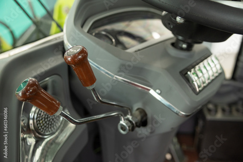 © Дмитри Лобакин, Fototapeta premium Steering wheel for forklift with ball rotating handle. Forklift handle - industrial background. Forklifts in a warehouse.